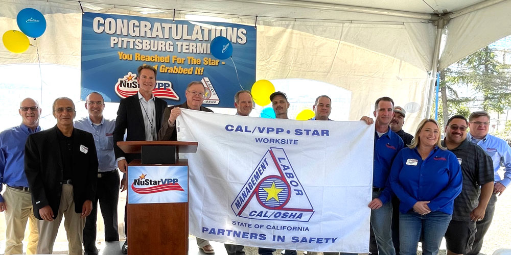 Published October 12, 2022 at 1000 × 500 in A Celebration Worth the Wait for Newest VPP Site Employees and Cal/OSHA personnel display NuStar Pittsburg’s VPP flag. Employees and Cal/OSHA personnel display NuStar Pittsburg’s VPP flag.