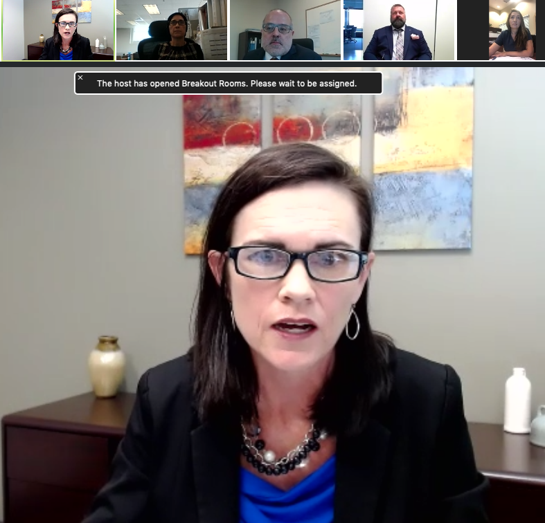 Appeals Board ALJ Kerry Lewis presided over the board’s first-ever videoconference hearing. Pictured at the top are some of the participants in the hearing.
