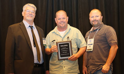 Matt Wright, Holiday Rock (center), with presenters Russell Morton (left) and Matthew Smylie. Morton and Smylie are chairs of CalCIMA’s Safety and Health Committee.