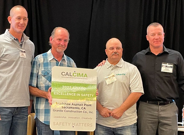 Asphalt plant winner: Granite’s Bradshaw Asphaltic Concrete Plant, Sacramento; l. to r.: Jake Hinchey, manager of construction materials; Ted Nicholas, regional plants maintenance superintendent; Lloyd Christensen, asphalt plant foreman; Josh Peterson, safety manager.