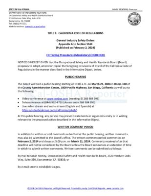 Respirator Fit-Testing Protocols Proposal Published on: February 22, 2024 Cal/OSHA Standards Board will hear this rulemaking based on Fed-OSHA requirements on March 21 in San Diego.