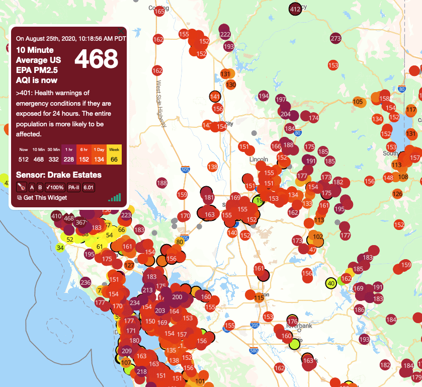 The PurpleAir website shows Air Quality Index levels around Northern California during the most recent wildfires. The 468 AQI was from smoke from the Walbridge Fire in the mountains above the Russian River in Sonoma County. PurpleAir supplies information to the fire.airnow.gov AQI site.